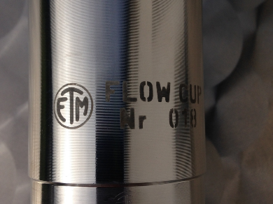 Kennzeichnung mit FTM Logo und Seriennummer. Alternativ kann die Beschriftung des Messbechers individuell nach Vorgabe erfolgen (Firmenlogo etc.).
